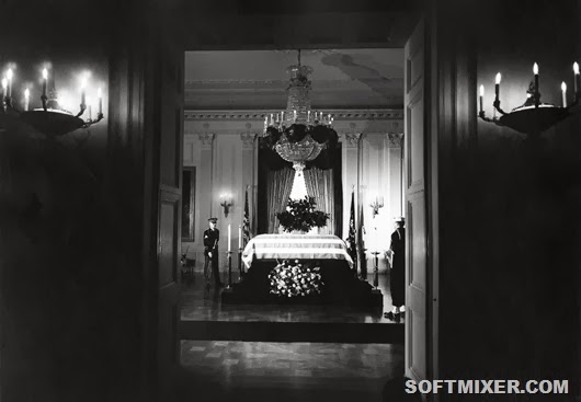 Гроб с телом Кеннеди был выставлен для прощания в Восточном зале Белого дома, прежде чем он был перемещен в Ротонду Капитолия. / (Abbie Rowe/White House/President John F. Kennedy Library)