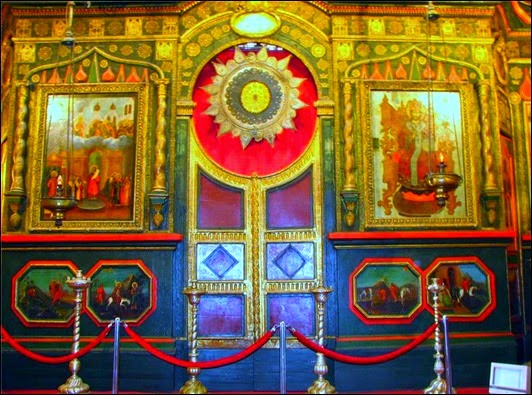 В 70-е годы во время реставрации в стене обнаружили винтовую деревянную лестницу. По ней и попадают сейчас посетители музея в центральный храм, где могут увидеть великолепный взмывающий в небо шатер и ценнейший иконостас, а также пройтись по узкому лабиринту внутренней галереи, расписанной дивными узорами.